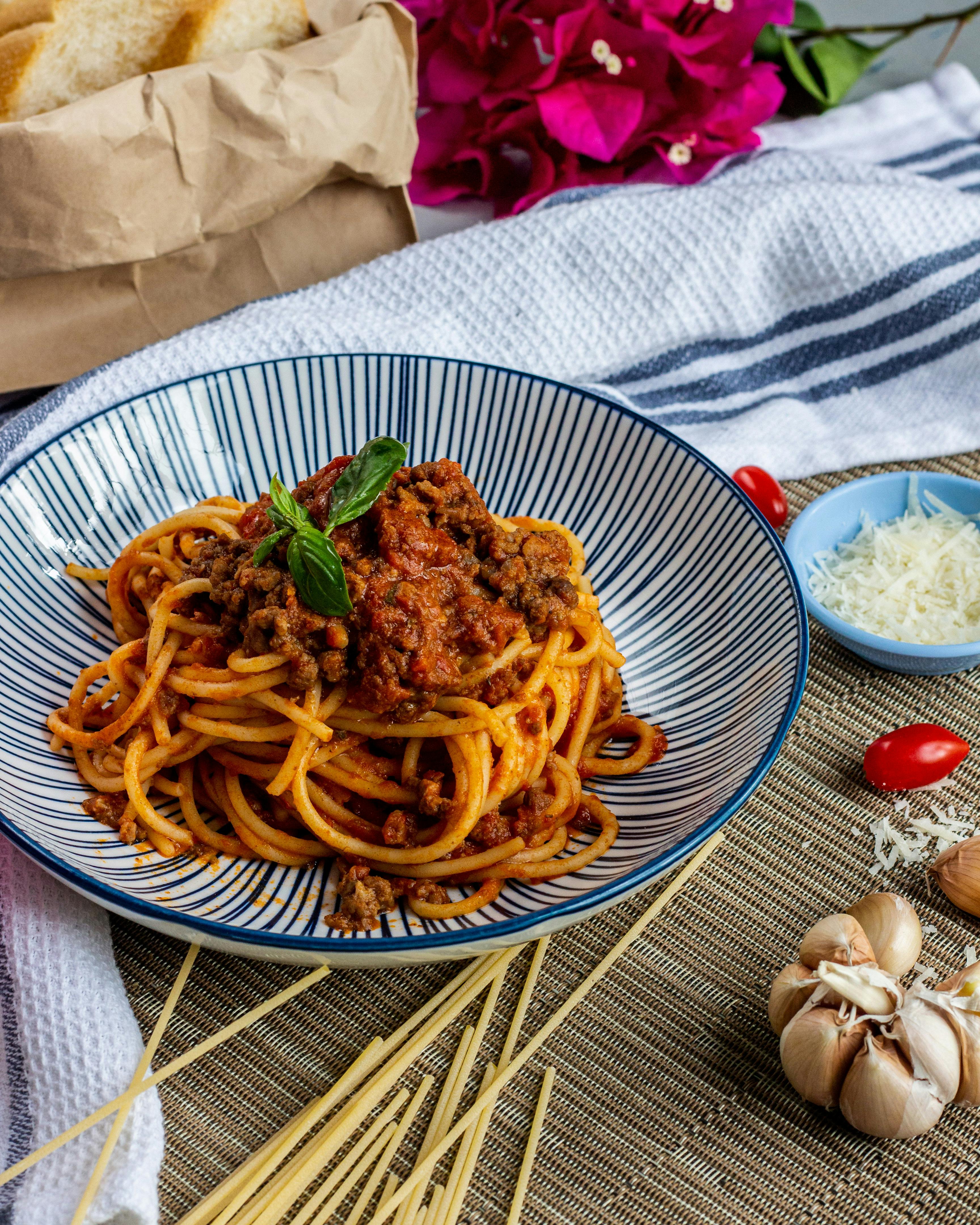 Nuestros abundantes espaguetis a la boloñesa incluyen pasta perfectamente cocida cubierta con una rica y sabrosa salsa de carne picada, ideal para satisfacer el apetito de sus clientes.